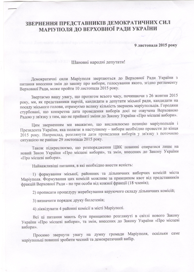Сегодня в Мариуполе представители демократических сил обратились к Верховной Раде Украины с просьбой рассмотреть в качестве даты проведения выборов 29 ноября 2015 года.
